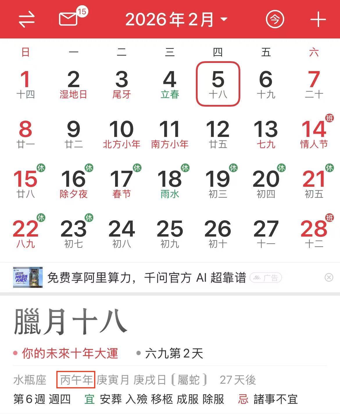 2026年的立春是2026年2月4日早上4∶02,所以过了2月4日早上4∶02就迈入马年。我们再来看2026年2月5日 ,干支纪年就进入丙午年。