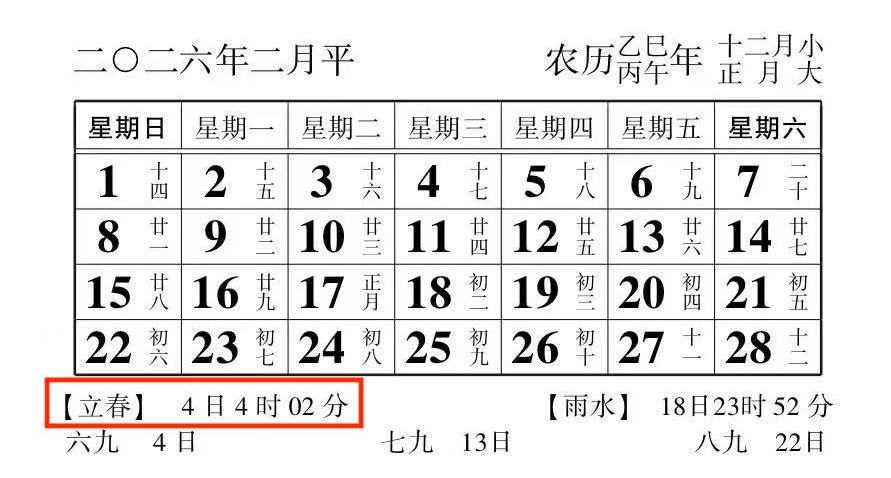 2026年的立春是2026年2月4日早上4:02,所以過了2月4日早上4:02就邁入馬年。我們再來看2026年2月5日 ,干支紀年就進入丙午年。